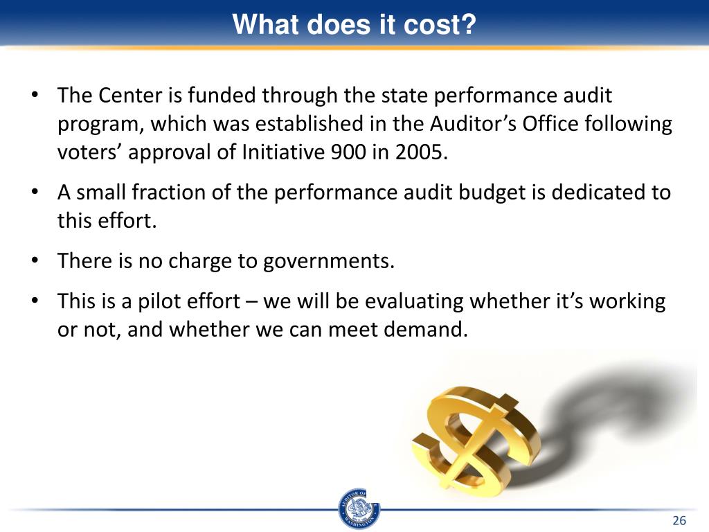 What does it cost? • The Center is funded through the state performance audit program, which was established in the Auditor’s Office following voters’ approval of Initiative 900 in 2005. • A small fraction of the performance audit budget is dedicated to this effort. • There is no charge to governments. • This is a pilot effort – we will be evaluating whether it’s working or not, and whether we can meet demand.