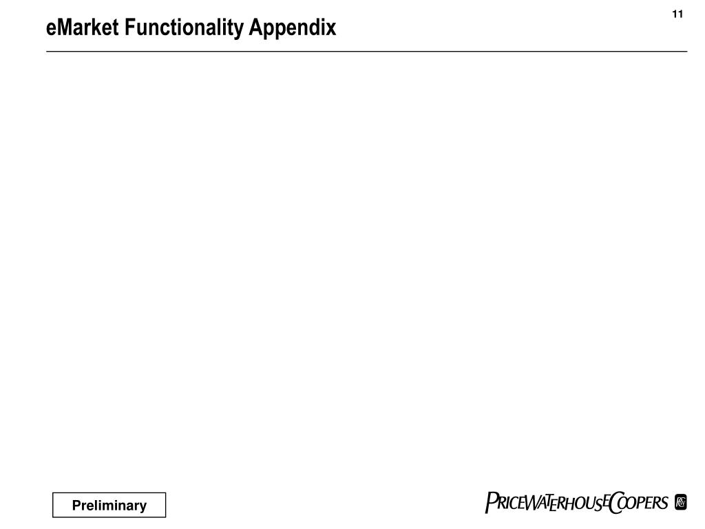 PwC points of view based on key lessons learned across several eMarkets (cont.) Development Period Key Learning Representative eMarket Representative Experience Build • Create an independent governing entity (as much as possible) • Utility consortium • PwC is seen as an independent third party and has led much of the decision making • Be aware that many technologies are still in the process of being created • Utility consortium, Pharma, Worldwide Retail Exchange • See functionality appendix which was created with input from e-business tech group • Clarify approach to staffing • Utility Consortium • 15% of equity has been set-aside for staff compensation. Executive search firms have been engaged. eMarket experience within industry is non-existent. Still are in the process of staffing Operate • TBD • TBD • TBD