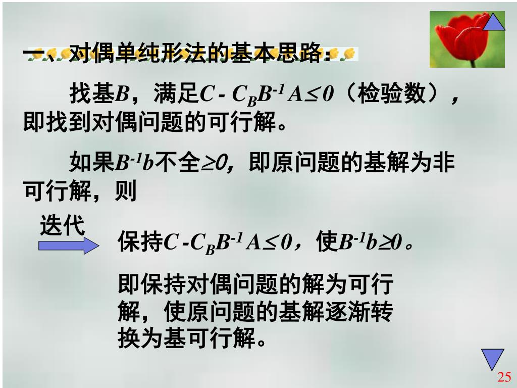 迭代 保持B-1b0,使C-CBB-1 A 0,即CBB-1 A C,(保持原问题的为基可行解,寻找对偶问题的可行解) 思路:(max型) 单纯形法:找基B,满足B-1b0,即先找到基可行解,当C- CBB-1 A不全 0,(即检验数)。