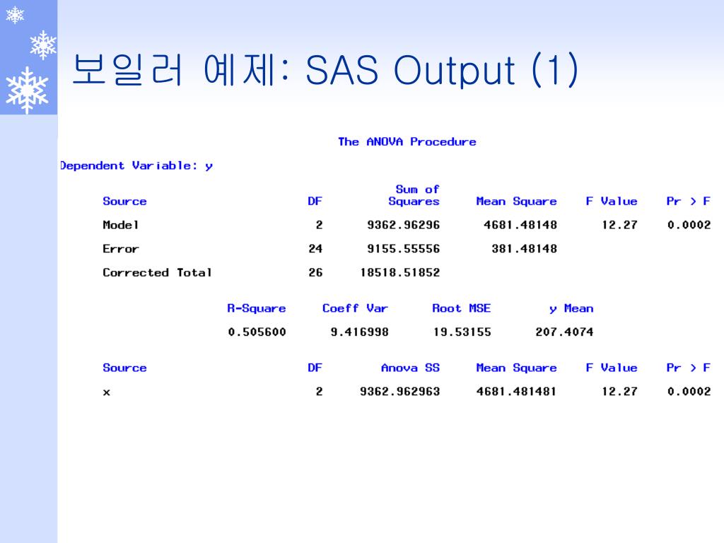 [예] 우리나라 가정용 기름보일러 시장의 대부분을 점유하고 있는 A, B, C 세 회사의 제품을 9개씩 무작위로 추출하여 열효율을 조사한 결과는 다음과 같다. 보일러 회사 A B C 210 180 250 230 200 240 220 190 240 180 160 250 240 170 210 200 210 220 190 150 200 230 180 220 220 200 210 SST, SSTR, SSE를 구하시오.