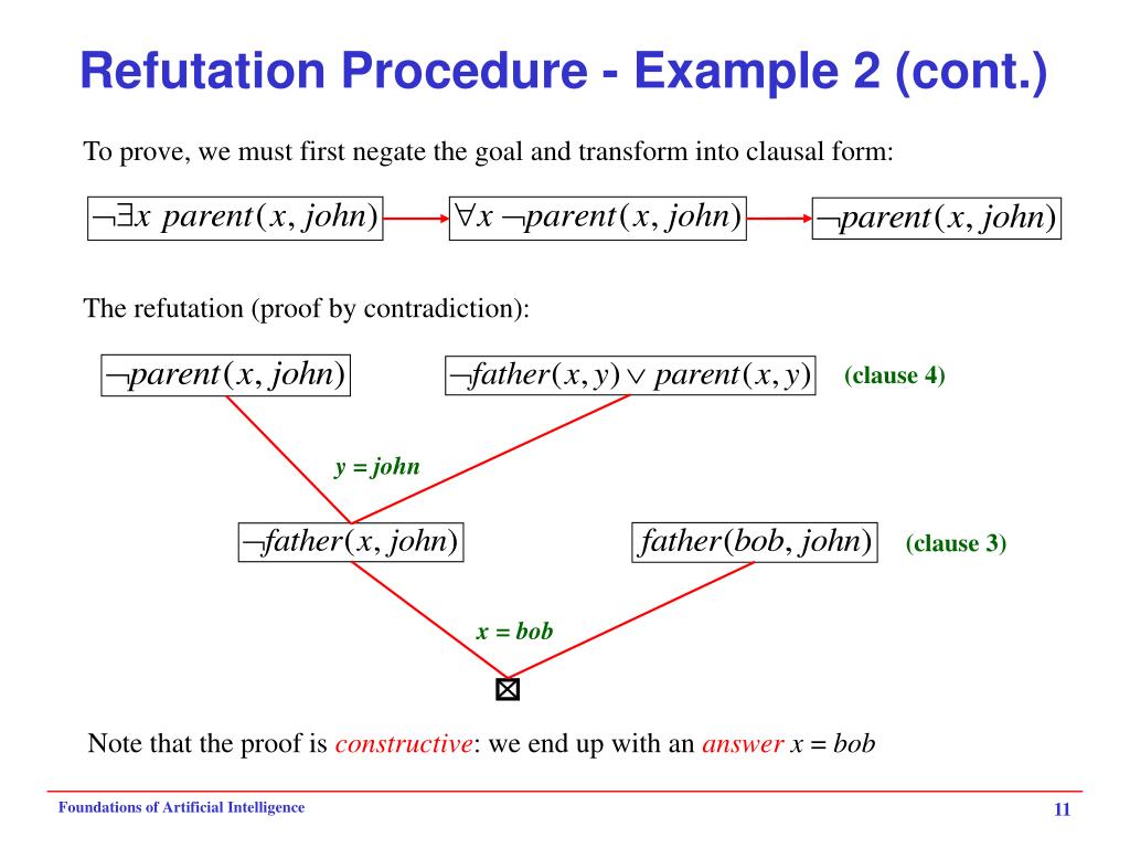 Refutation Procedure - Example 2 (cont.) To prove, we must first negate the goal and transform into clausal form: The refutation (proof by contradiction): (clause 4) y = john (clause 3) x = bob Note that the proof is constructive: we end up with an answerx = bob Foundations of Artificial Intelligence