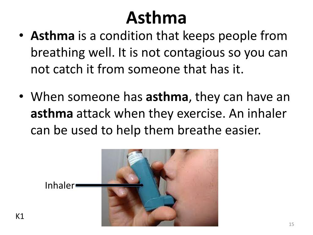 Asthma • Asthmais a condition that keeps people from breathing well. It is not contagious so you can not catch it from someone that has it. • When someone has asthma, they can have an asthma attack when they exercise. An inhaler can be used to help them breathe easier. Inhaler K1