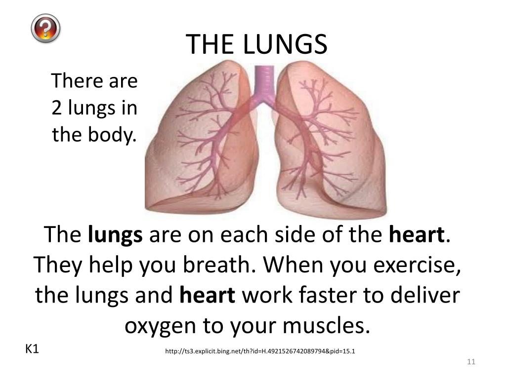 THE HEART • The heart pumps blood all over the body. • When you exercise, the heart beats faster to pump blood to the muscles. • When you sleep, the heart slows down. This is so the heart and body can rest. K1 http://thumbs.dreamstime.com/z/human-heart-lungs-10674263.jpg