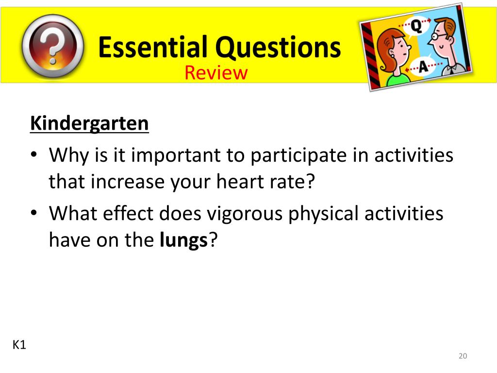 Kindergarten • Why is it important to participate in activities that increase your heart rate? • What effect does vigorous physical activities have on the lungs? K