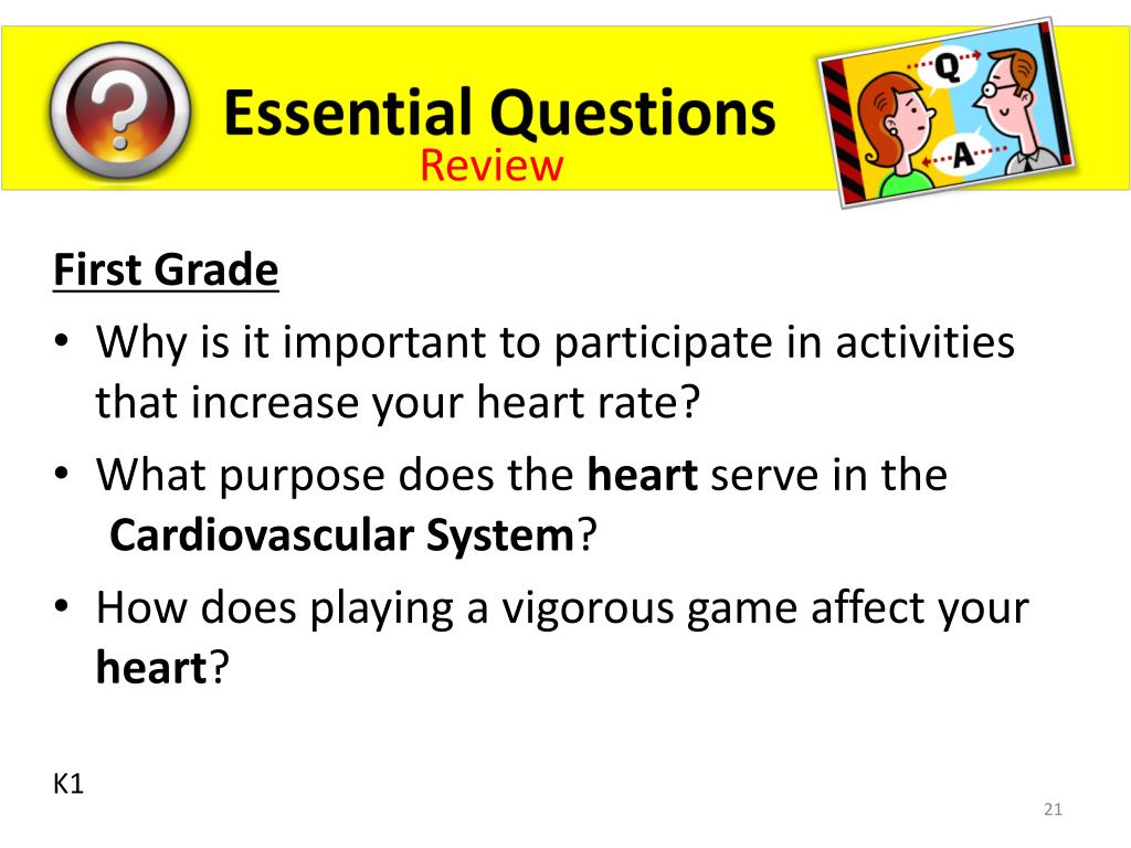 Review First Grade • Why is it important to participate in activities that increase your heart rate? • What purpose does the heart serve in the Cardiovascular System? • How does playing a vigorous game affect your heart? K1