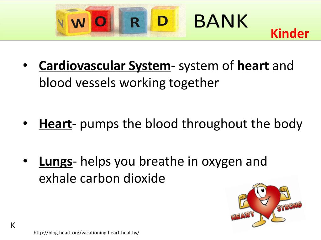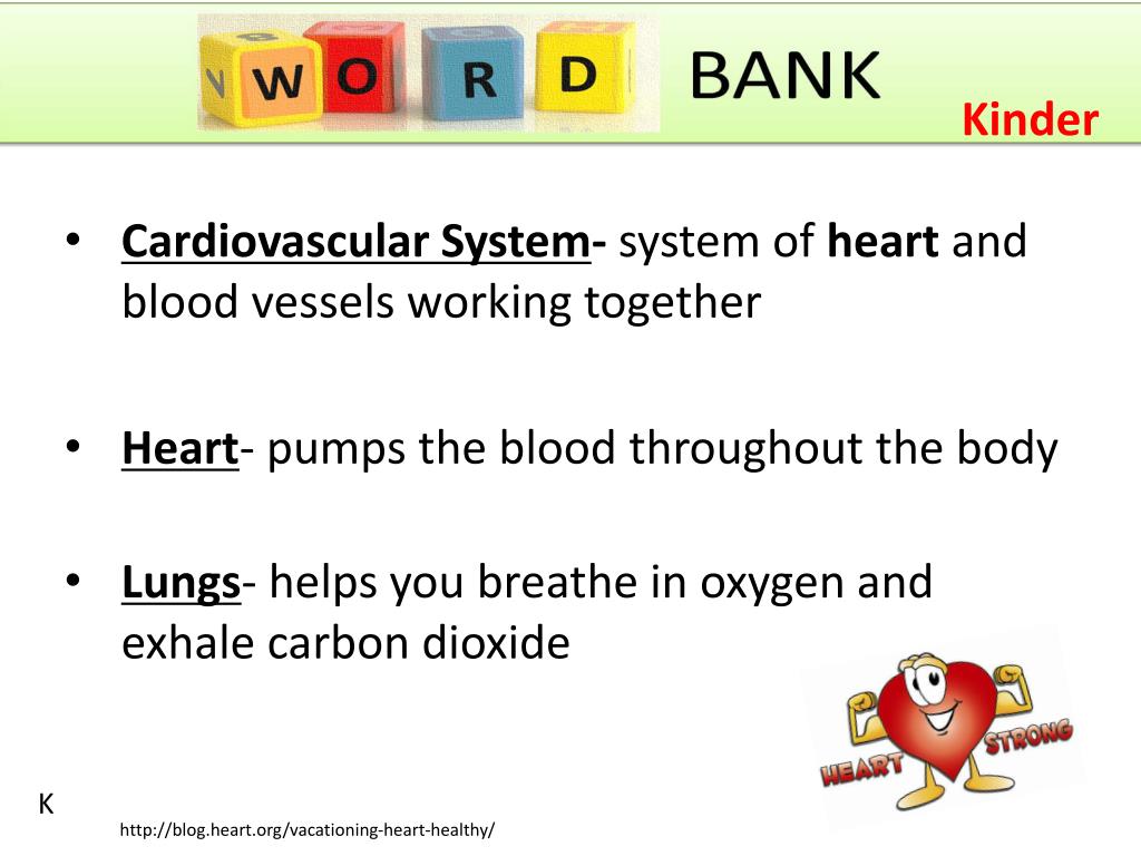 Kinder Cardiovascular System- system of heart and blood vessels working together Heart- pumps the blood throughout the body Lungs- helps you breathe in oxygen and exhale carbon dioxide K http://blog.heart.org/vacationing-heart-healthy/