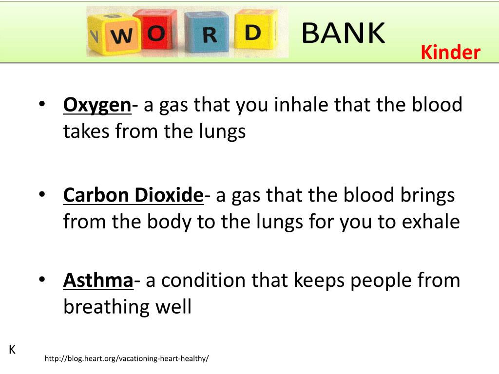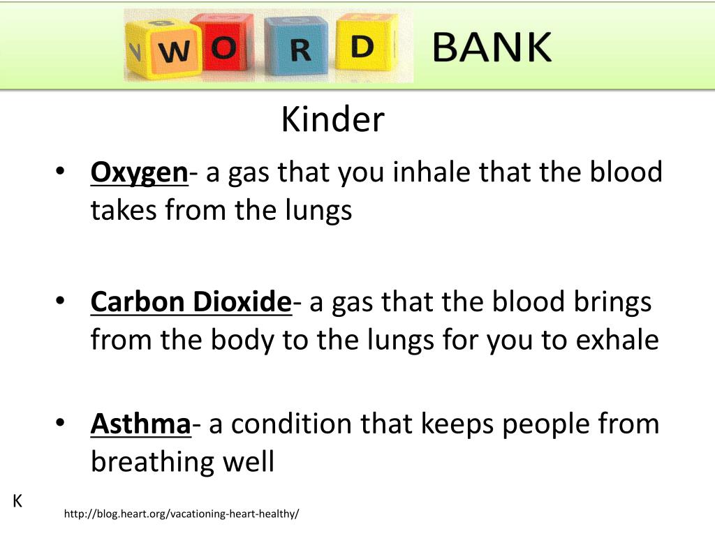 Kinder • Oxygen- a gas that you inhale that the blood takes from the lungs • Carbon Dioxide- a gas that the blood brings from the body to the lungs for you to exhale • Asthma- a condition that keeps people from breathing well K http://blog.heart.org/vacationing-heart-healthy/