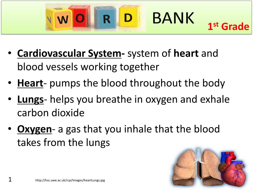 1st Grade • Cardiovascular System- system of heart and blood vessels working together • Heart- pumps the blood throughout the body • Lungs- helps you breathe in oxygen and exhale carbon dioxide • Oxygen- a gas that you inhale that the blood takes from the lungs 1 http://hsc.uwe.ac.uk/rcp/Images/heartLungs.jpg