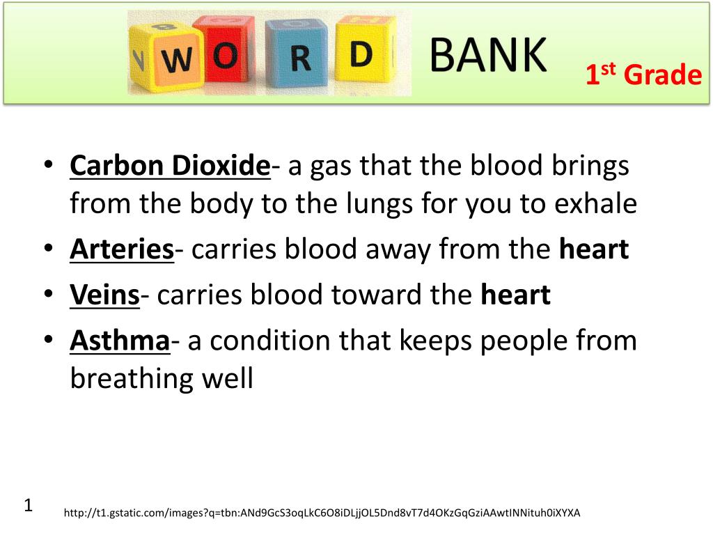 1st Grade • Carbon Dioxide- a gas that the blood brings from the body to the lungs for you to exhale • Arteries- carries blood away from the heart • Veins- carries blood toward the heart • Asthma- a condition that keeps people from breathing well 1 http://t1.gstatic.com/images?q=tbn:ANd9GcS3oqLkC6O8iDLjjOL5Dnd8vT7d4OKzGqGziAAwtINNituh0iXYXA