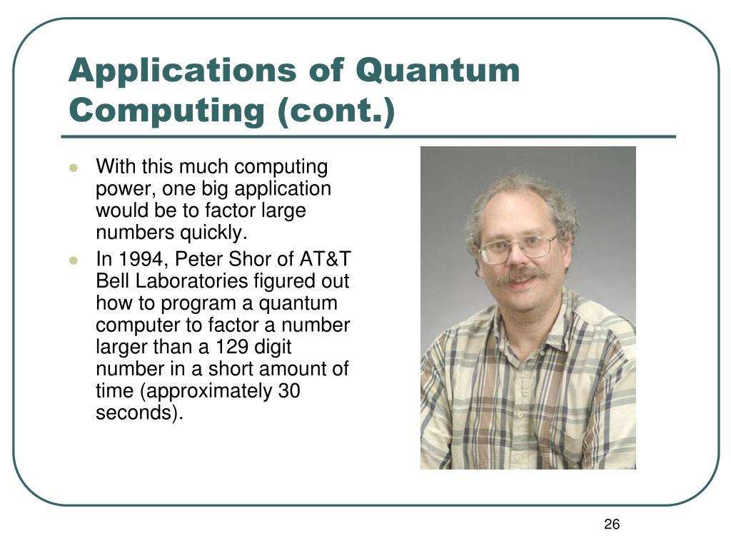 Applications of Quantum Computing (cont.) • With this much computing power, one big application would be to factor large numbers quickly. • In 1994, Peter Shor of AT&T Bell Laboratories figured out how to program a quantum computer to factor a number larger than a 129 digit number in a short amount of time (approximately 30 seconds).