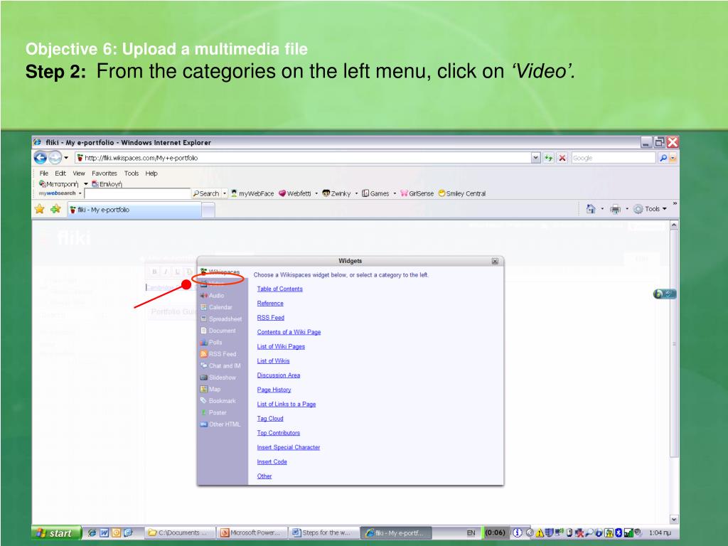 Objective 6: Upload a multimedia fileStep 4: Once you click on the icon you want (e.g. ‘You Tube’), the ‘Widgets’ window appears. This provides a set of instructions explaining how to embed the video. Follow instructions to upload a video. C.Yerou and S.Hadjiconstantinou