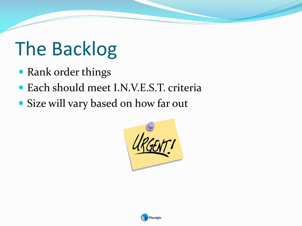 The Backlog • Rank order things • Each should meet I.N.V.E.S.T. criteria • Size will vary based on how far out