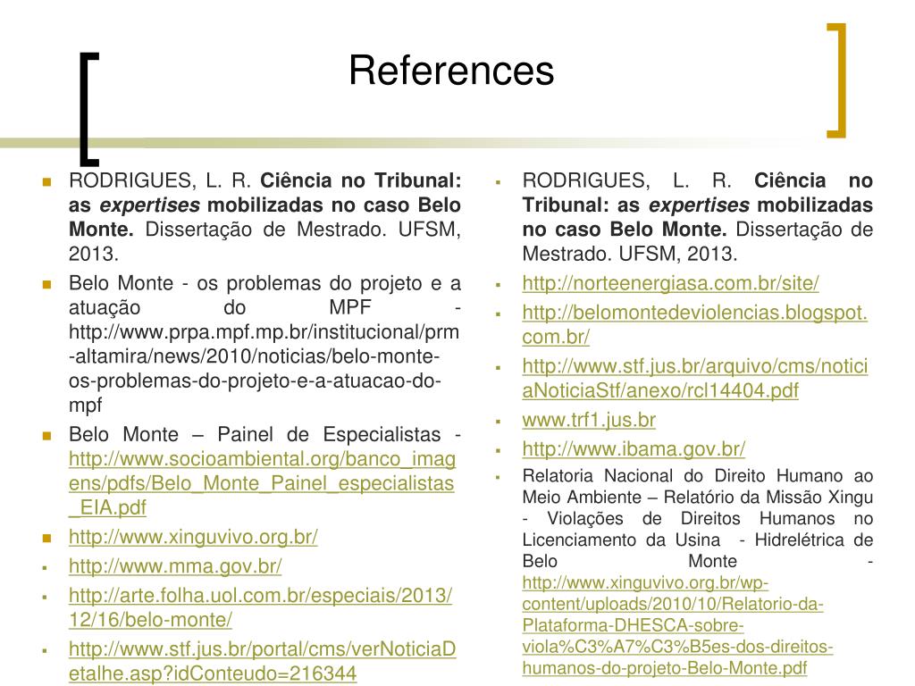 References • RODRIGUES, L. R. Ciência no Tribunal: as expertises mobilizadas no caso Belo Monte. Dissertação de Mestrado. UFSM, 2013. • Belo Monte - os problemas do projeto e a atuação do MPF - http://www.prpa.mpf.mp.br/institucional/prm-altamira/news/2010/noticias/belo-monte-os-problemas-do-projeto-e-a-atuacao-do-mpf • Belo Monte – Painel de Especialistas - http://www.socioambiental.org/banco_imagens/pdfs/Belo_Monte_Painel_especialistas_EIA.pdf • http://www.xinguvivo.org.br/ • http://www.mma.gov.br/ • http://arte.folha.uol.com.br/especiais/2013/12/16/belo-monte/ • http://www.stf.jus.br/portal/cms/verNoticiaDetalhe.asp?idConteudo=216344 • RODRIGUES, L. R. Ciência no Tribunal: as expertises mobilizadas no caso Belo Monte. Dissertação de Mestrado. UFSM, 2013. • http://norteenergiasa.com.br/site/ • http://belomontedeviolencias.blogspot.com.br/ • http://www.stf.jus.br/arquivo/cms/noticiaNoticiaStf/anexo/rcl14404.pdf • www.trf1.jus.br • http://www.ibama.gov.br/ • Relatoria Nacional do Direito Humano ao Meio Ambiente – Relatório da Missão Xingu - Violações de Direitos Humanos no Licenciamento da Usina - Hidrelétrica de Belo Monte - http://www.xinguvivo.org.br/wp-content/uploads/2010/10/Relatorio-da-Plataforma-DHESCA-sobre-viola%C3%A7%C3%B5es-dos-direitos-humanos-do-projeto-Belo-Monte.pdf