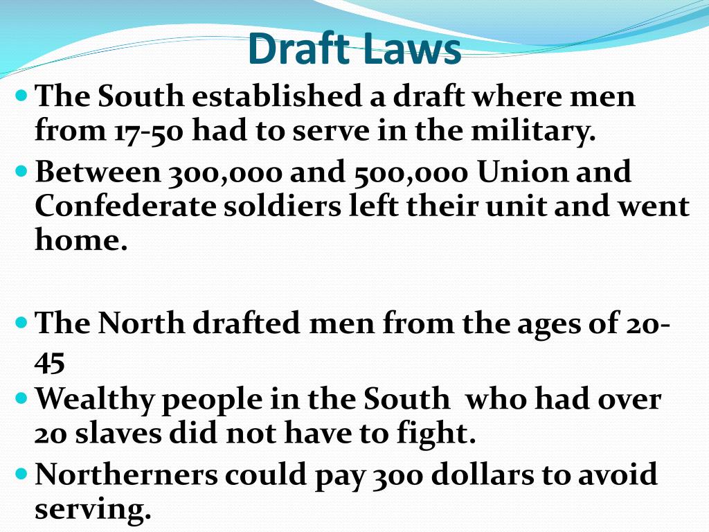 Draft Laws • The South established a draft where men from 17-50 had to serve in the military. • Between 300,000 and 500,000 Union and Confederate soldiers left their unit and went home. • The North drafted men from the ages of 20-45 • Wealthy people in the South who had over 20 slaves did not have to fight. • Northerners could pay 300 dollars to avoid serving.