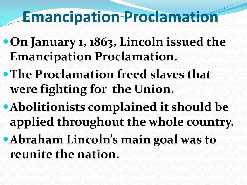 Emancipation Proclamation • On January 1, 1863, Lincoln issued the Emancipation Proclamation. • The Proclamation freed slaves that were fighting for the Union. • Abolitionists complained it should be applied throughout the whole country. • Abraham Lincoln’s main goal was to reunite the nation.