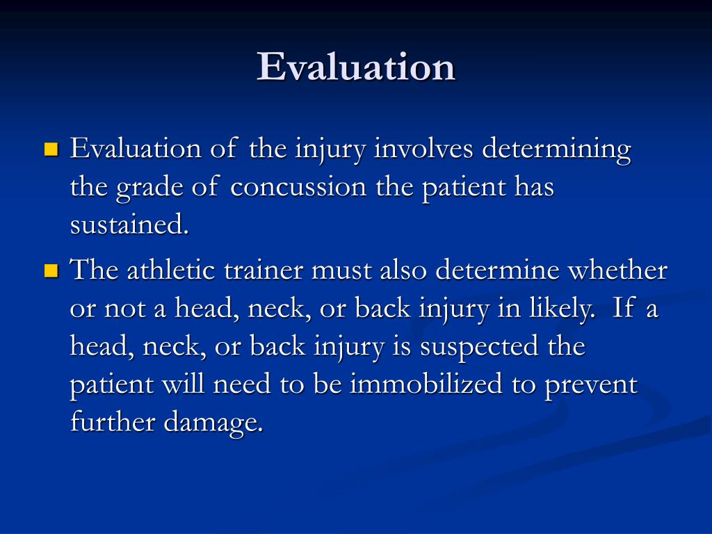 Evaluation • Evaluation of the injury involves determining the grade of concussion the patient has sustained. • The athletic trainer must also determine whether or not a head, neck, or back injury in likely. If a head, neck, or back injury is suspected the patient will need to be immobilized to prevent further damage.
