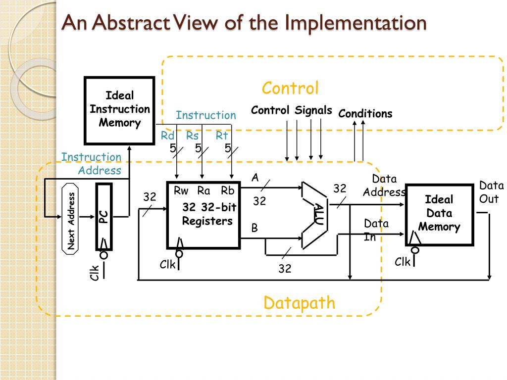 ALU PC Clk An Abstract View of the Implementation Control Ideal Instruction Memory Control Signals Conditions Instruction Rd Rs Rt 5 5 5 Instruction Address A Data Address Data Out 32 Rw Ra Rb 32 Ideal Data Memory 32 32 32-bit Registers Next Address Data In B Clk Clk 32 Datapath