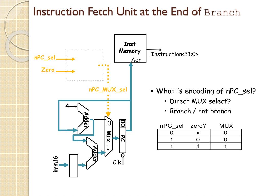Instruction<31:0> Inst Memory nPC_sel Zero Adr nPC_MUX_sel 4 0 00 Adder PC 1 Mux Clk imm16 Adder Instruction Fetch Unit at the End of Branch • What is encoding of nPC_sel? • Direct MUX select? • Branch / not branch