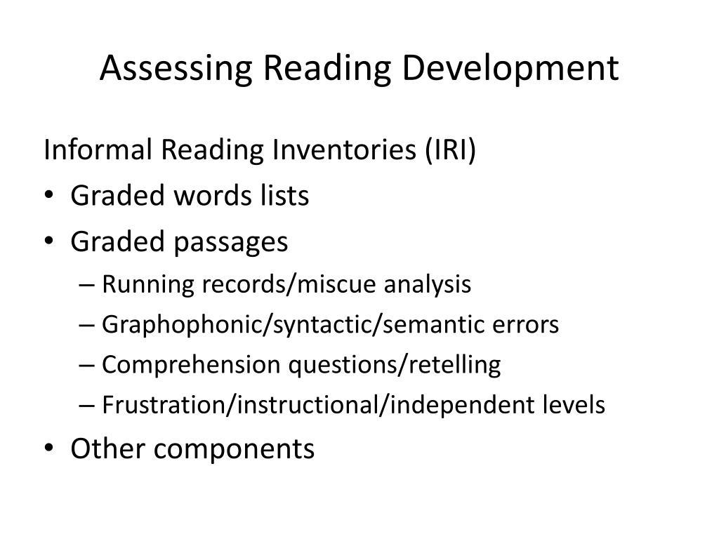 Assessing Reading Development Informal Reading Inventories (IRI) • Graded words lists • Graded passages • Running records/miscue analysis • Graphophonic/syntactic/semantic errors • Comprehension questions/retelling • Frustration/instructional/independent levels • Other components