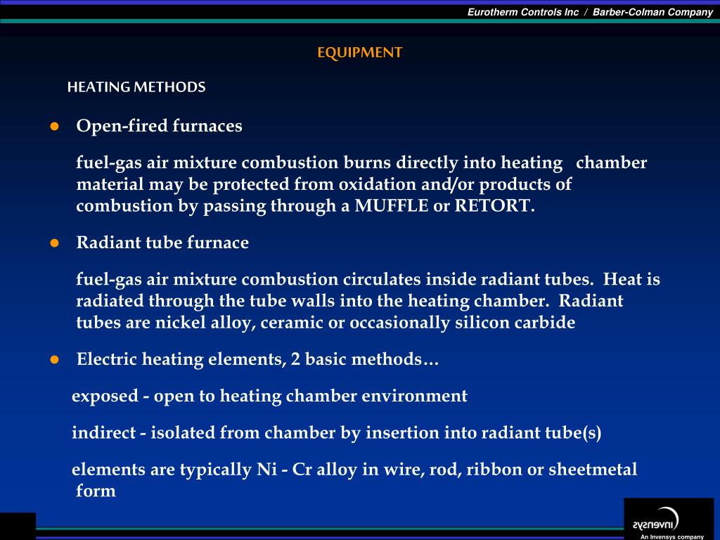EQUIPMENT HEATING METHODS • Open-fired furnaces fuel-gas air mixture combustion burns directly into heating chamber material may be protected from oxidation and/or products of combustion by passing through a MUFFLE or RETORT. • Radiant tube furnace fuel-gas air mixture combustion circulates inside radiant tubes. Heat is radiated through the tube walls into the heating chamber. Radiant tubes are nickel alloy, ceramic or occasionally silicon carbide • Electric heating elements, 2 basic methods… exposed - open to heating chamber environment indirect - isolated from chamber by insertion into radiant tube(s) elements are typically Ni - Cr alloy in wire, rod, ribbon or sheetmetal form