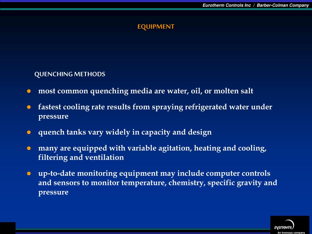 EQUIPMENT QUENCHING METHODS • most common quenching media are water, oil, or molten salt • fastest cooling rate results from spraying refrigerated water under pressure • quench tanks vary widely in capacity and design • many are equipped with variable agitation, heating and cooling, filtering and ventilation • up-to-date monitoring equipment may include computer controls and sensors to monitor temperature, chemistry, specific gravity and pressure