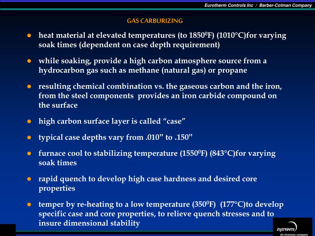 GAS CARBURIZING • heat material at elevated temperatures (to 18500F) (1010°C)for varying soak times (dependent on case depth requirement) • while soaking, provide a high carbon atmosphere source from a hydrocarbon gas such as methane (natural gas) or propane • resulting chemical combination vs. the gaseous carbon and the iron, from the steel components provides an iron carbide compound on the surface • high carbon surface layer is called “case” • typical case depths vary from .010” to .150” • furnace cool to stabilizing temperature (15500F) (843°C)for varying soak times • rapid quench to develop high case hardness and desired core properties • temper by re-heating to a low temperature (3500F) (177°C)to develop specific case and core properties, to relieve quench stresses and to insure dimensional stability