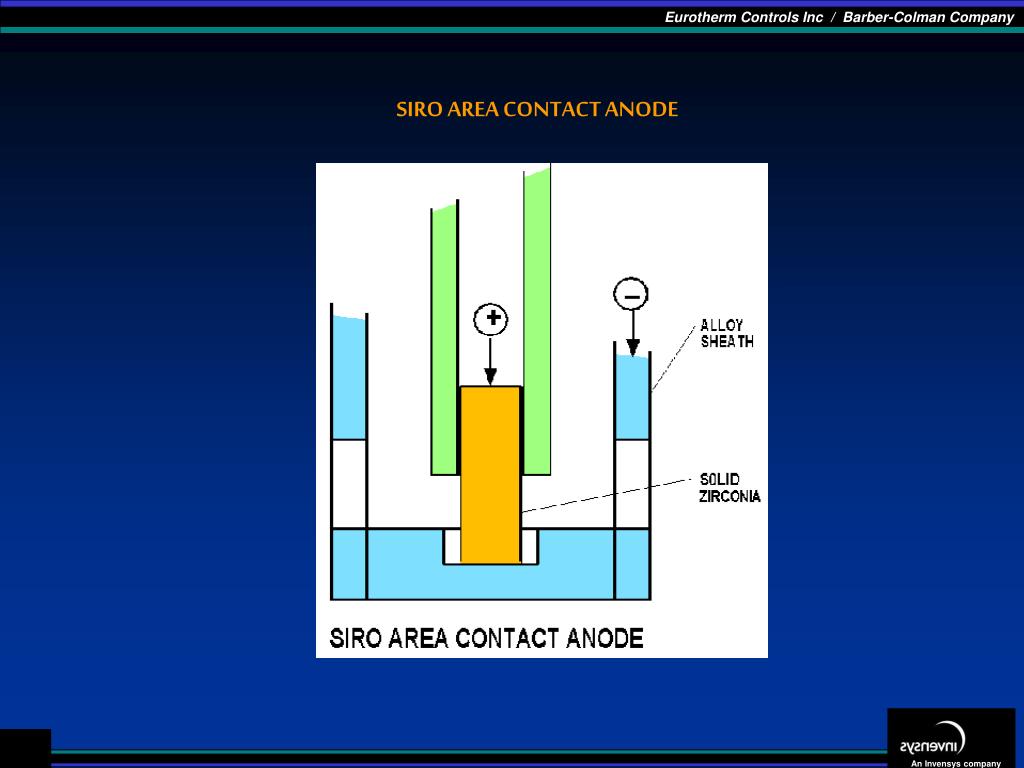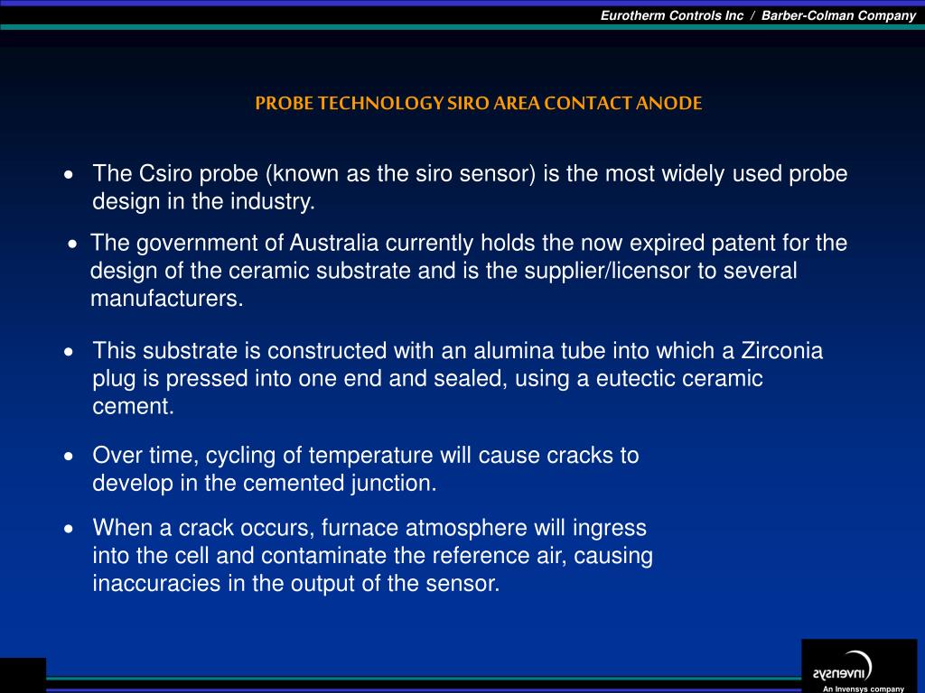 PROBE TECHNOLOGY SIRO AREA CONTACT ANODE • The Csiro probe (known as the siro sensor) is the most widely used probe design in the industry. • The government of Australia currently holds the now expired patent for the design of the ceramic substrate and is the supplier/licensor to several manufacturers. • This substrate is constructed with an alumina tube into which a Zirconia plug is pressed into one end and sealed, using a eutectic ceramic cement. • Over time, cycling of temperature will cause cracks to develop in the cemented junction. • When a crack occurs, furnace atmosphere will ingress into the cell and contaminate the reference air, causing inaccuracies in the output of the sensor.