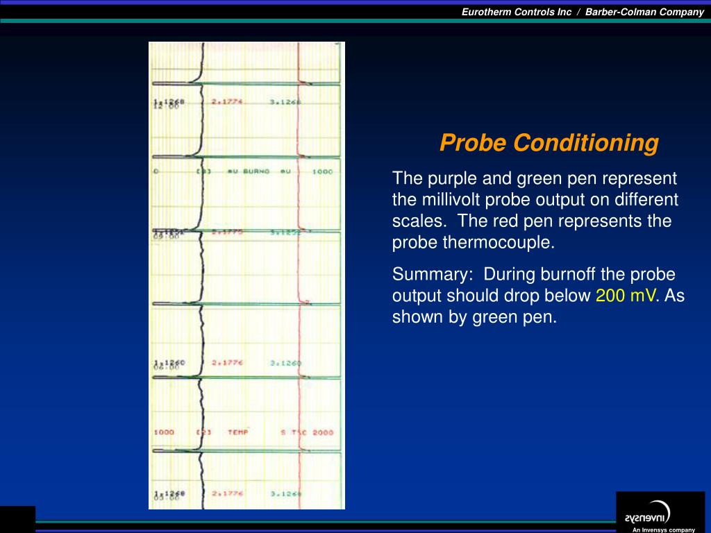 Probe Conditioning The purple and green pen represent the millivolt probe output on different scales. The red pen represents the probe thermocouple. Summary: During burnoff the probe output should drop below 200 mV. As shown by green pen.