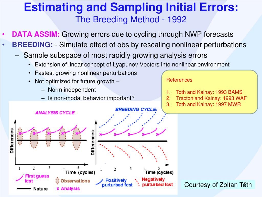Estimating and Sampling Initial Errors:The Breeding Method - 1992 • DATA ASSIM: Growing errors due to cycling through NWP forecasts • BREEDING: - Simulate effect of obs by rescaling nonlinear perturbations • Sample subspace of most rapidly growing analysis errors • Extension of linear concept of Lyapunov Vectors into nonlinear environment • Fastest growing nonlinear perturbations • Not optimized for future growth – • Norm independent • Is non-modal behavior important? • References • Toth and Kalnay: 1993 BAMS • Tracton and Kalnay: 1993 WAF • Toth and Kalnay: 1997 MWR Courtesy of Zoltan Toth