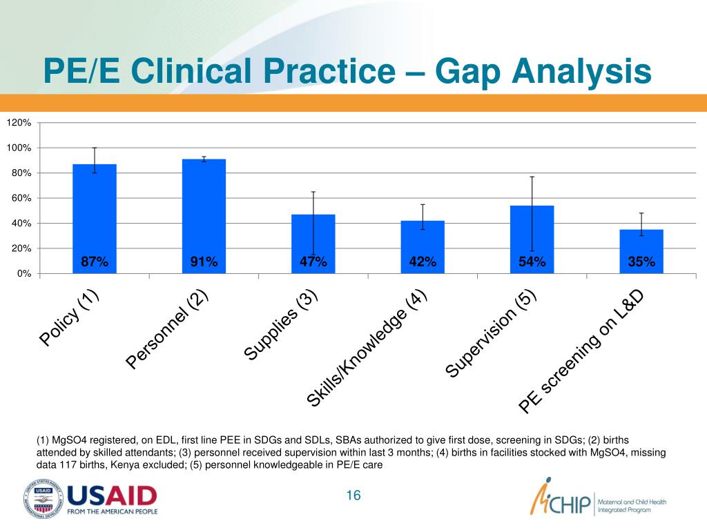 PE/E Clinical Practice – Gap Analysis (1) MgSO4 registered, on EDL, first line PEE in SDGs and SDLs, SBAs authorized to give first dose, screening in SDGs; (2) births attended by skilled attendants; (3) personnel received supervision within last 3 months; (4) births in facilities stocked with MgSO4, missing data 117 births, Kenya excluded; (5) personnel knowledgeable in PE/E care