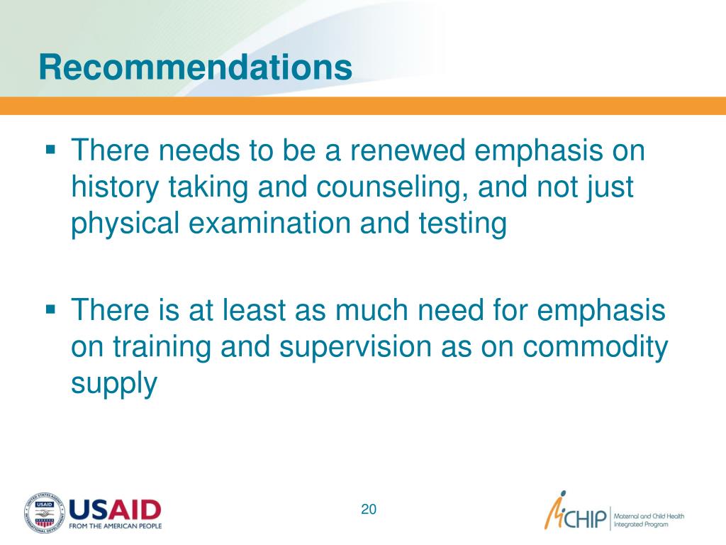 Recommendations • There needs to be a renewed emphasis on history taking and counseling, and not just physical examination and testing • There is at least as much need for emphasis on training and supervision as on commodity supply