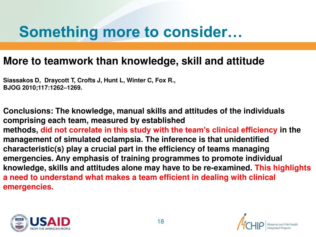 Something more to consider… More to teamwork than knowledge, skill and attitude Siassakos D, Draycott T, Crofts J, Hunt L, Winter C, Fox R., BJOG 2010;117:1262–1269. Conclusions: The knowledge, manual skills and attitudes of the individuals comprising each team, measured by established methods, did not correlate in this study with the team’s clinical efficiency in the management of simulated eclampsia. The inference is that unidentified characteristic(s) play a crucial part in the efficiency of teams managing emergencies. Any emphasis of training programmes to promote individual knowledge, skills and attitudes alone may have to be re-examined. This highlights a need to understand what makes a team efficient in dealing with clinical emergencies.