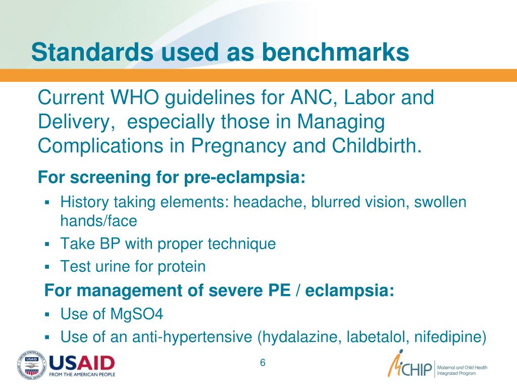 Standards used as benchmarks Current WHO guidelines for ANC, Labor and Delivery, especially those in Managing Complications in Pregnancy and Childbirth. For screening for pre-eclampsia: • History taking elements: headache, blurred vision, swollen hands/face • Take BP with proper technique • Test urine for protein For management of severe PE / eclampsia: • Use of MgSO4 • Use of an anti-hypertensive (hydalazine, labetalol, nifedipine)