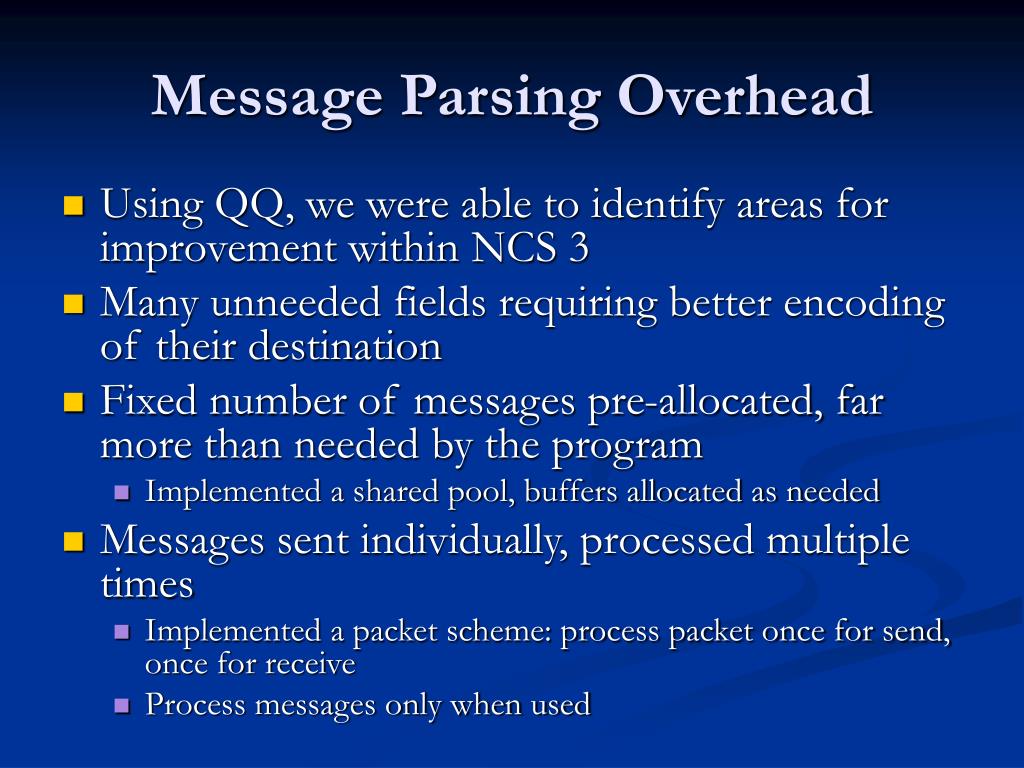 Message Parsing Overhead • Using QQ, we were able to identify areas for improvement within NCS 3 • Many unneeded fields requiring better encoding of their destination • Fixed number of messages pre-allocated, far more than needed by the program • Implemented a shared pool, buffers allocated as needed • Messages sent individually, processed multiple times • Implemented a packet scheme: process packet once for send, once for receive • Process messages only when used