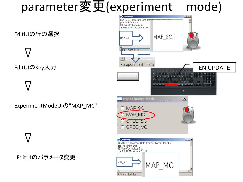 parameter変更(experiment mode) EditUIの行の選択 EditUIのKey入力 EN_UPDATE ExperimentModeUIの"MAP_MC" EditUIのパラメータ変更