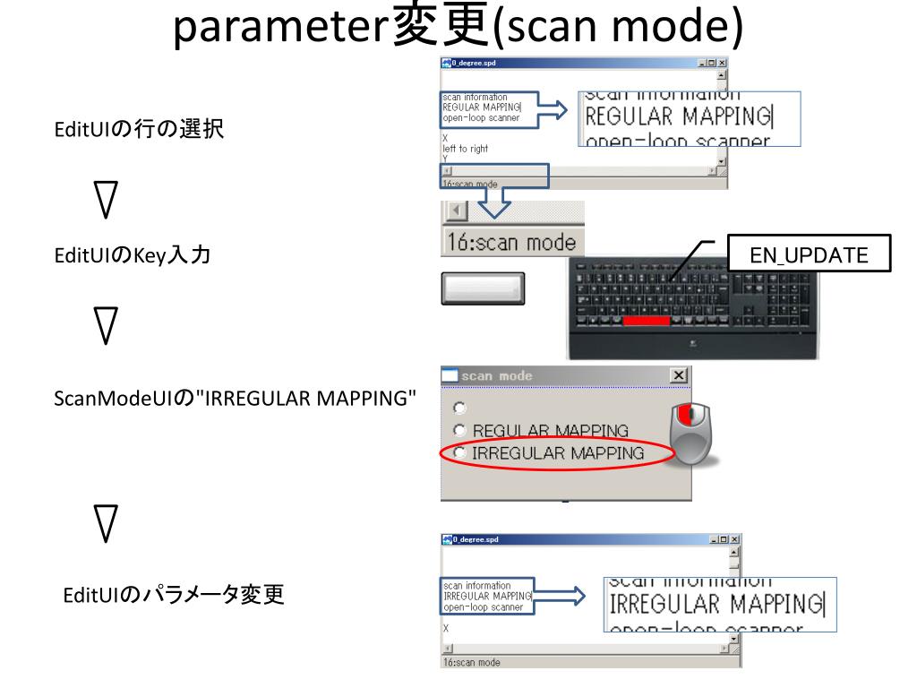 parameter変更(scan mode) EditUIの行の選択 EN_UPDATE EditUIのKey入力 ScanModeUIの"IRREGULAR MAPPING" EditUIのパラメータ変更