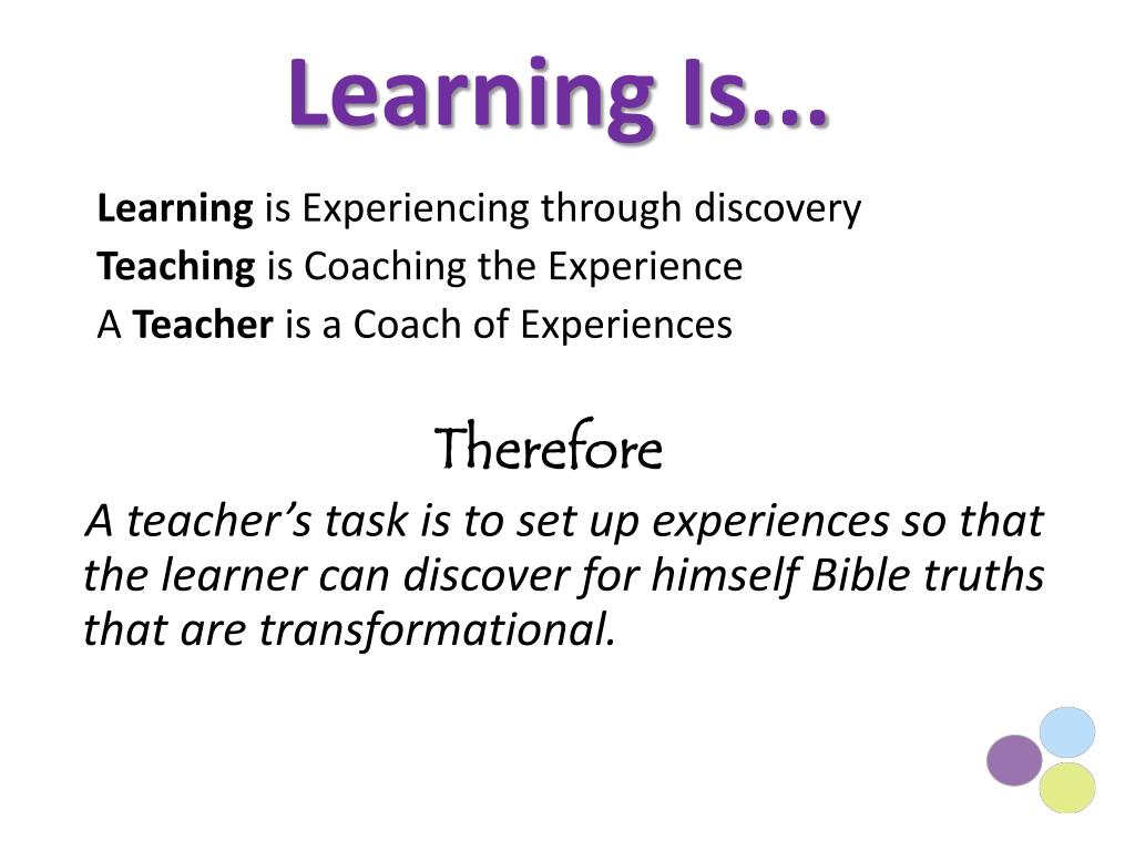 Learning Is... Learning is Experiencing through discovery Teaching is Coaching the Experience A Teacher is a Coach of Experiences Therefore A teacher’s task is to set up experiences so that the learner can discover for himself Bible truths that are transformational.