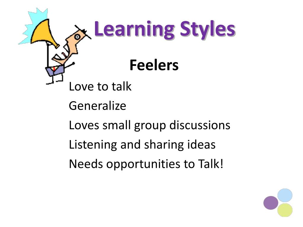 Learning Styles Feelers Love to talk Generalize Loves small group discussions Listening and sharing ideas Needs opportunities to Talk!