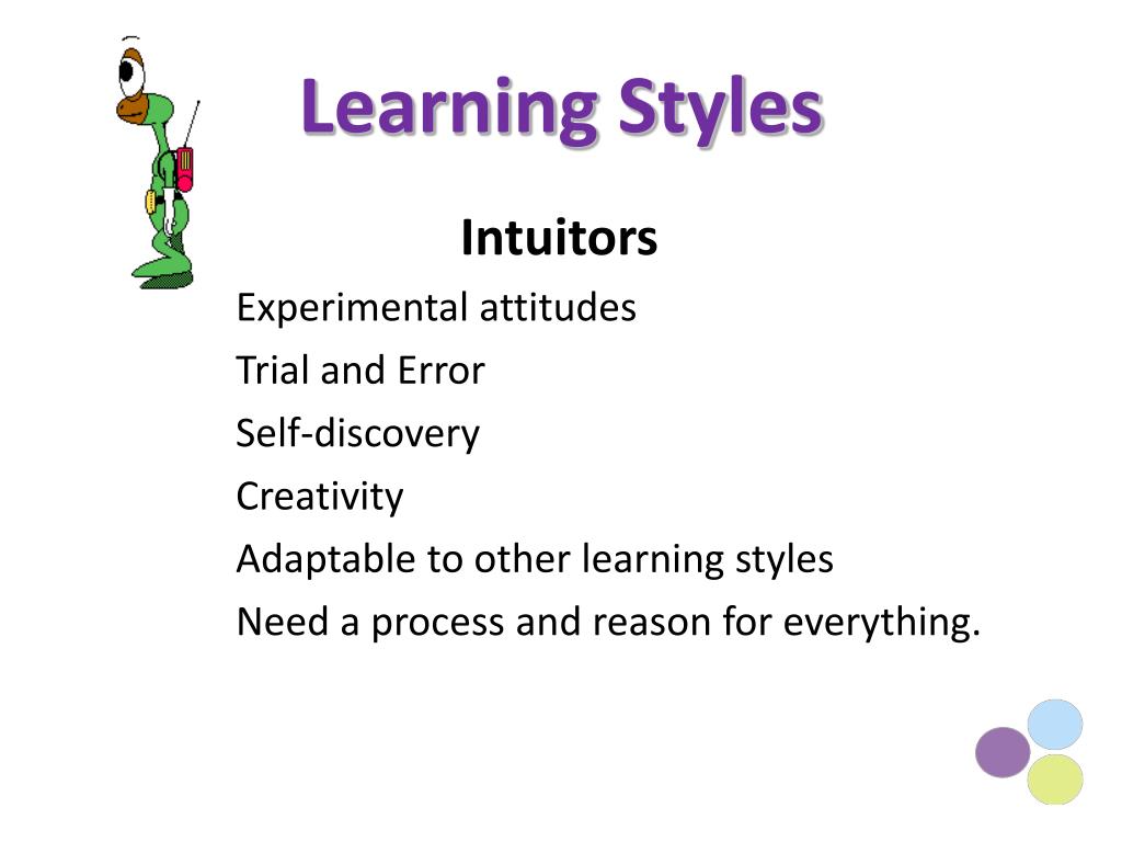 Learning Styles Intuitors Experimental attitudes Trial and Error Self-discovery Creativity Adaptable to other learning styles Need a process and reason for everything.