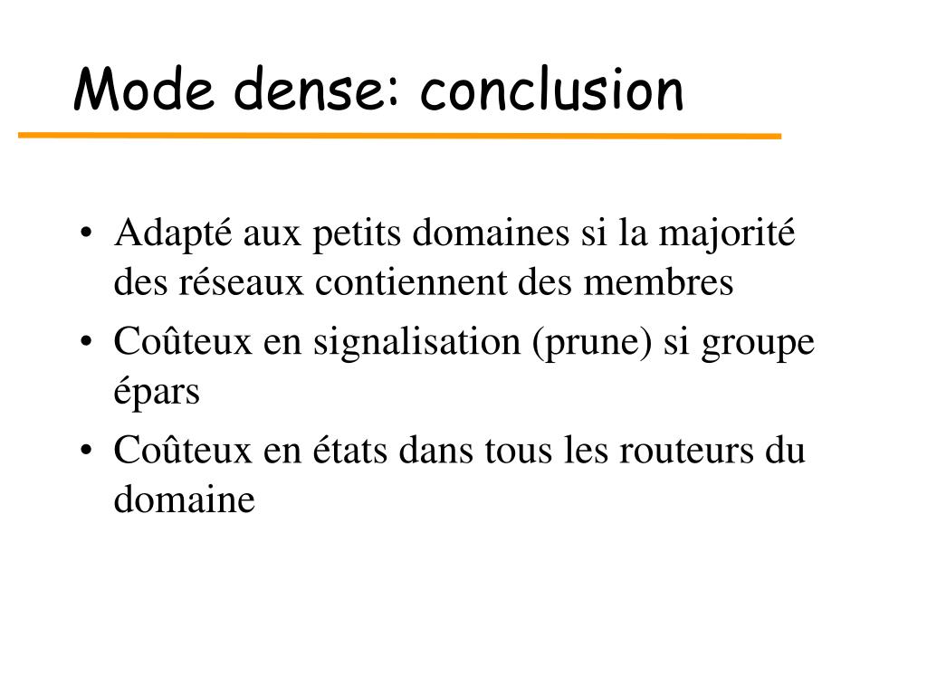 Mode dense: conclusion • Adapté aux petits domaines si la majorité des réseaux contiennent des membres • Coûteux en signalisation (prune) si groupe épars • Coûteux en états dans tous les routeurs du domaine