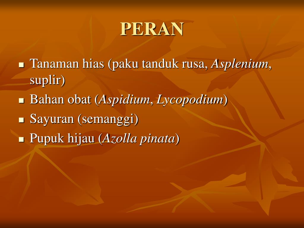 PERAN • Tanaman hias (paku tanduk rusa, Asplenium, suplir) • Bahan obat (Aspidium, Lycopodium) • Sayuran (semanggi) • Pupuk hijau (Azolla pinata)