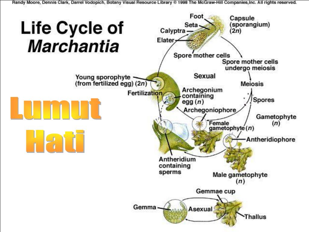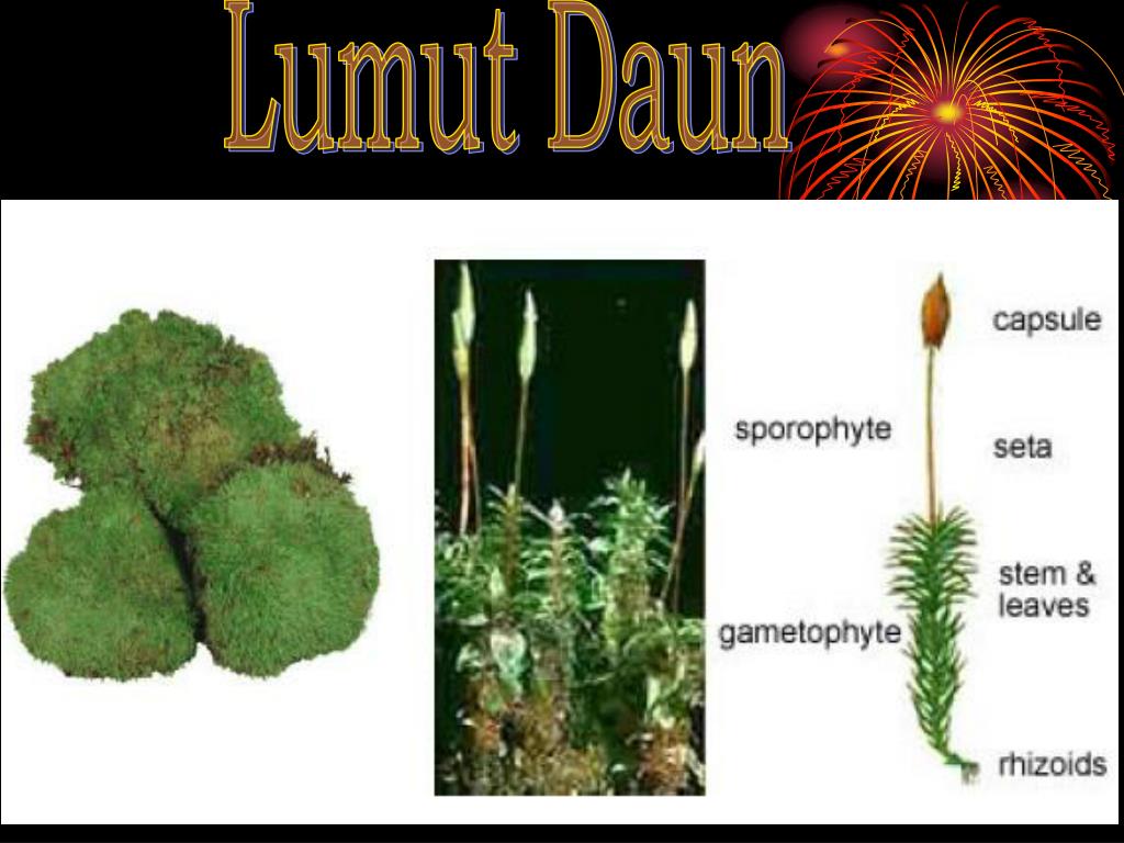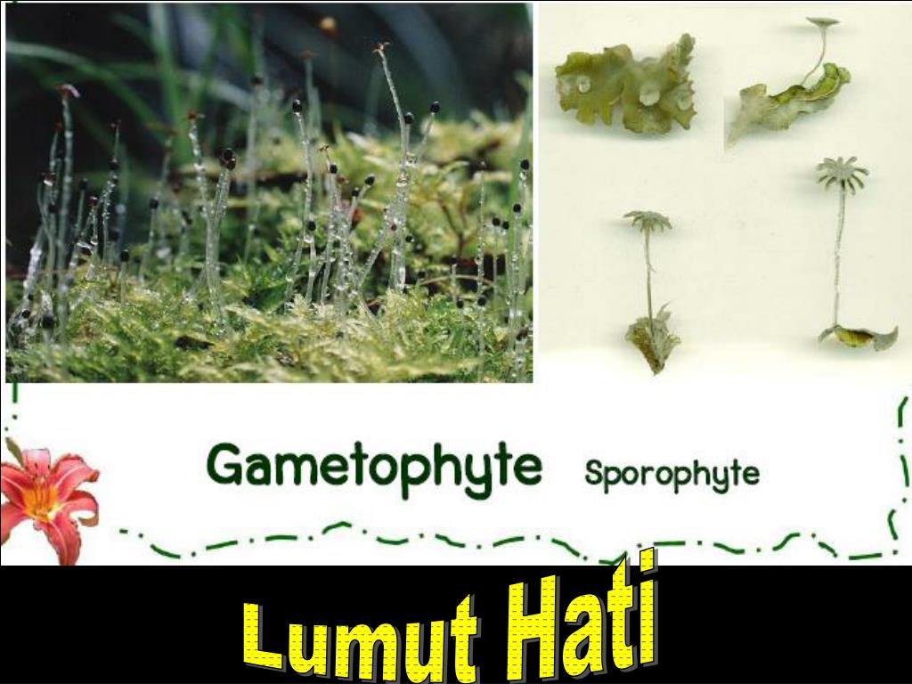LUMUT Tubuh lumut dibedakan menjadi 2, yaitu 1. Sporofit : tubuh penghasil spora 2. Gametofit: tubuh penghasil gamet (sel kelamin: sperma & ovum) Oleh karena itulah lumut disebut mengalai metagenesis (pergiliran keturunan)
