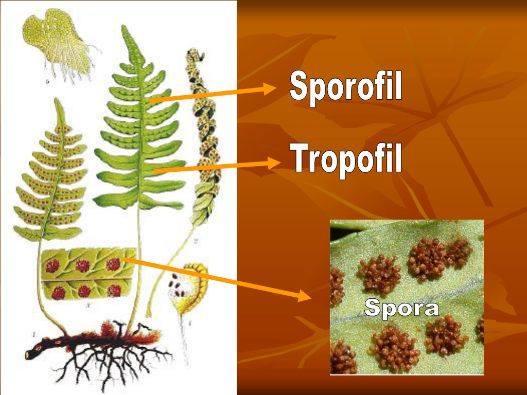 ADA DUA JENIS DAUN TUMBUHAN PAKU (ada tidaknya spora) • Daun fertil / sporofil (penghasil spora) • Daun steril / tropofil(tanpa spora)