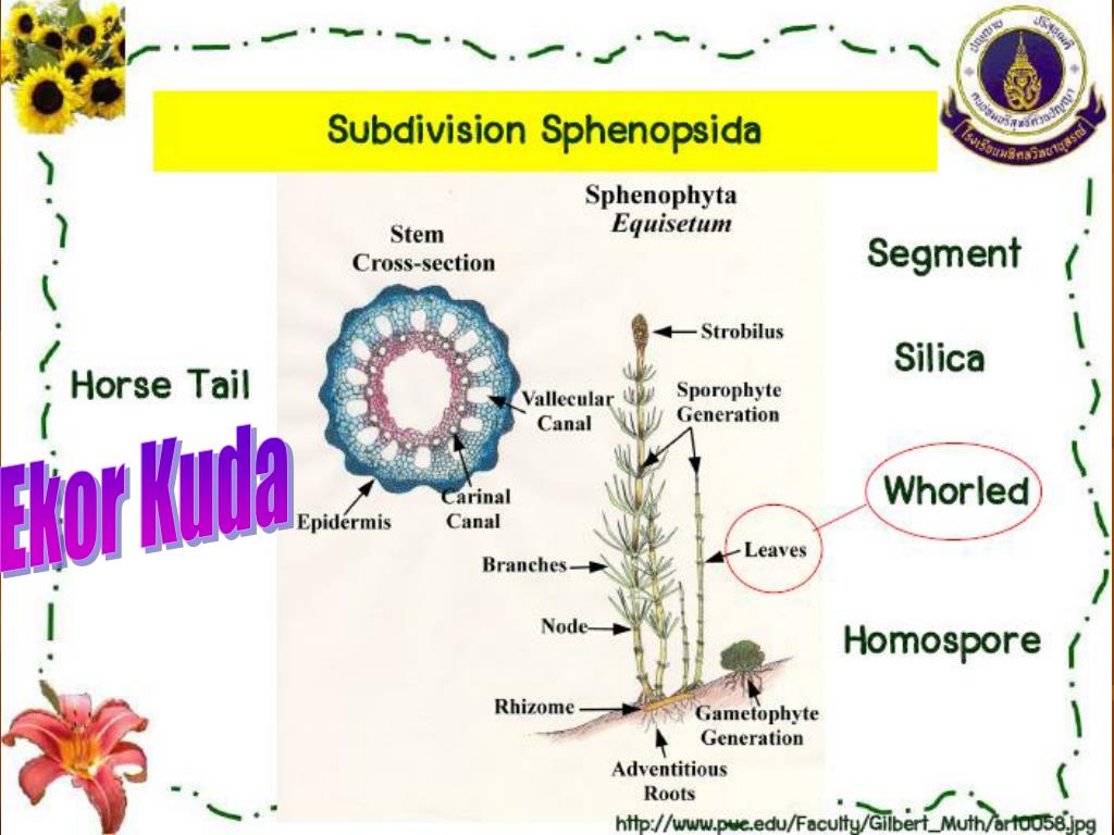 CIRI – CIRI PTERIDOPHITA • Sering disebut juga kormofita berspora • Sering disebut juga Tracheophyta • Telah memiliki akar, batang, dan daun sejati • Memiliki klorofil • Ukuran dan bentuk tubuh (2cm – 5m ) • Ada dua generasi (sporofit dan gametofit) • Sporofit adalah tumbuhan yang dominan. • Terjadi metagenesis.