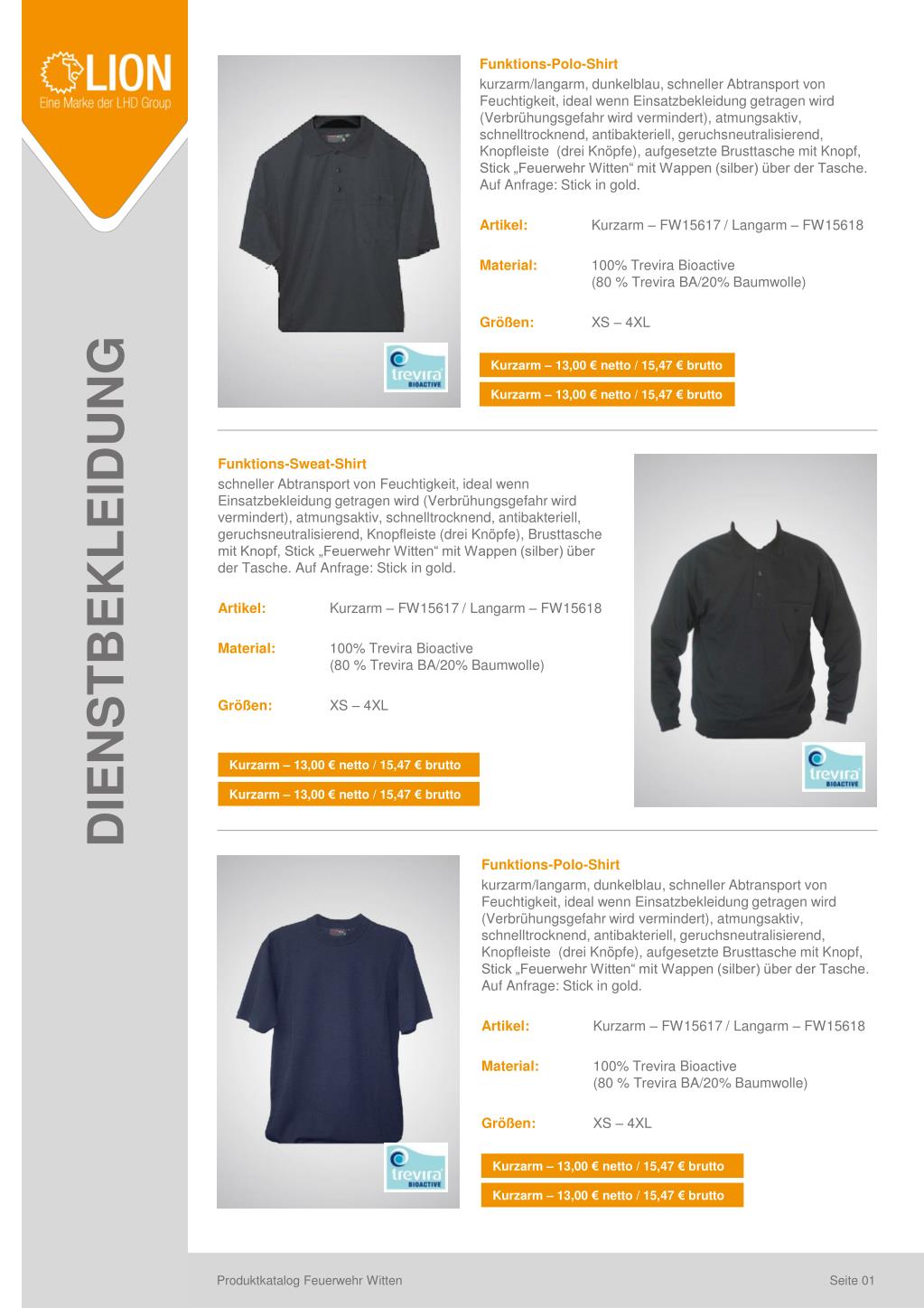 DIENSTBEKLEIDUNG Produktkatalog Feuerwehr Witten Seite 01 Funktions-Polo-Shirt kurzarm/langarm, dunkelblau, schneller Abtransport von Feuchtigkeit, ideal wenn Einsatzbekleidung getragen wird (Verbrühungsgefahr wird vermindert), atmungsaktiv, schnelltrocknend, antibakteriell, geruchsneutralisierend, Knopfleiste (drei Knöpfe), aufgesetzte Brusttasche mit Knopf, Stick „Feuerwehr Witten“ mit Wappen (silber) über der Tasche. Auf Anfrage: Stick in gold. Artikel: Kurzarm – FW15617 / Langarm – FW15618 Material:100% Trevira Bioactive (80 % Trevira BA/20% Baumwolle) Größen: XS – 4XL Kurzarm – 13,00 € netto / 15,47 € brutto Kurzarm – 13,00 € netto / 15,47 € brutto Funktions-Sweat-Shirt schneller Abtransport von Feuchtigkeit, ideal wenn Einsatzbekleidung getragen wird (Verbrühungsgefahr wird vermindert), atmungsaktiv, schnelltrocknend, antibakteriell, geruchsneutralisierend, Knopfleiste (drei Knöpfe), Brusttasche mit Knopf, Stick „Feuerwehr Witten“ mit Wappen (silber) über der Tasche. Auf Anfrage: Stick in gold. Artikel: Kurzarm – FW15617 / Langarm – FW15618 Material: 100% Trevira Bioactive (80 % Trevira BA/20% Baumwolle) Größen: XS – 4XL Kurzarm – 13,00 € netto / 15,47 € brutto Kurzarm – 13,00 € netto / 15,47 € brutto Funktions-Polo-Shirt kurzarm/langarm, dunkelblau, schneller Abtransport von Feuchtigkeit, ideal wenn Einsatzbekleidung getragen wird (Verbrühungsgefahr wird vermindert), atmungsaktiv, schnelltrocknend, antibakteriell, geruchsneutralisierend, Knopfleiste (drei Knöpfe), aufgesetzte Brusttasche mit Knopf, Stick „Feuerwehr Witten“ mit Wappen (silber) über der Tasche. Auf Anfrage: Stick in gold. Artikel: Kurzarm – FW15617 / Langarm – FW15618 Material:100% Trevira Bioactive (80 % Trevira BA/20% Baumwolle) Größen: XS – 4XL Kurzarm – 13,00 € netto / 15,47 € brutto Kurzarm – 13,00 € netto / 15,47 € brutto