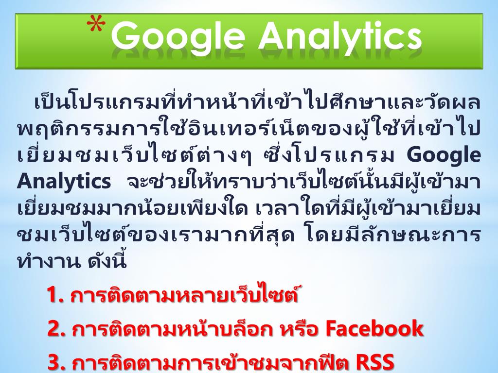 Google Analytics เป็นโปรแกรมที่ทำหน้าที่เข้าไปศึกษาและวัดผลพฤติกรรมการใช้อินเทอร์เน็ตของผู้ใช้ที่เข้าไปเยี่ยมชมเว็บไซต์ต่างๆ ซึ่งโปรแกรม Google Analytics จะช่วยให้ทราบว่าเว็บไซต์นั้นมีผู้เข้ามาเยี่ยมชมมากน้อยเพียงใด เวลาใดที่มีผู้เข้ามาเยี่ยมชมเว็บไซต์ของเรามากที่สุด โดยมีลักษณะการทำงาน ดังนี้ 1.การติดตามหลายเว็บไซต์ 2. การติดตามหน้าบล็อก หรือ Facebook 3. การติดตามการเข้าชมจากฟีต RSS 4. การใช้ Analytics ร่วมกับโซลูชั่นการวิเคราะห์เว็บอื่นๆ