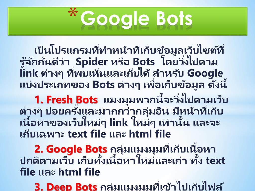 Google Bots เป็นโปรแกรมที่ทำหน้าที่เก็บข้อมูลเว็บไซต์ที่รู้จักกันดีว่า Spider หรือ Bots โดยวิ่งไปตาม link ต่างๆ ที่พบเห็นและเก็บได้ สำหรับ Google แบ่งประเภทของ Bots ต่างๆ เพื่อเก็บข้อมูล ดังนี้ 1. Fresh Bots แมงมุมพวกนี้จะวิ่งไปตามเว็บต่างๆ บ่อยครั้งและมากกว่ากลุ่มอื่น มีหน้าที่เก็บเนื้อหาของเว็บใหม่ๆ link ใหม่ๆ เท่านั้น และจะเก็บเฉพาะ text file และ html file 2. Google Bots กลุ่มแมงมุมที่เก็บเนื้อหาปกติตามเว็บ เก็บทั้งเนื้อหาใหม่และเก่า ทั้ง text file และ html file 3. Deep Bots กลุ่มแมงมุมที่เข้าไปเก็บไฟล์ทุกประเภทที่พบเจอ ทั้งไฟล์เอกสาร ไฟล์รูปภาพ และไฟล์ที่บีบอัดต่างๆ