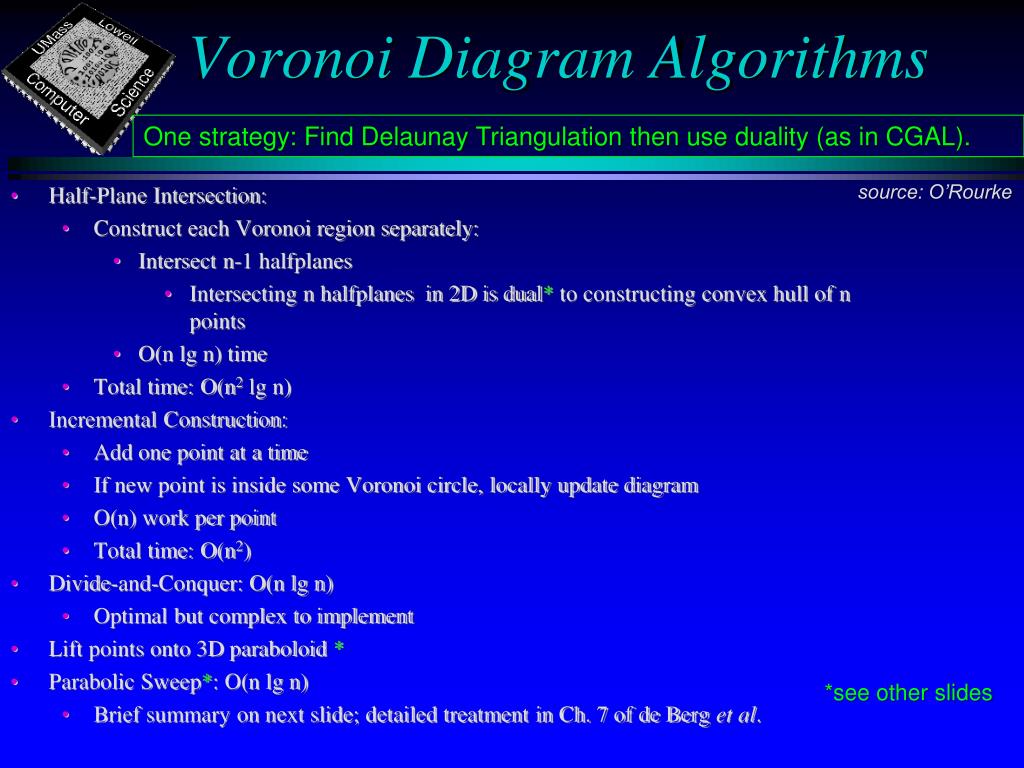 UMass Lowell Computer Science 91.504 Advanced Algorithms Computational Geometry Prof. Karen Daniels Spring, 2010. Voronoi Diagrams & Delaunay Triangulations O’Rourke: Chapter 5 de Berg et al.: Chapters 7, 9 (and a touch of Ch. 8) Thursday , 2/25/10. Voronoi Diagrams. Applications Preview
