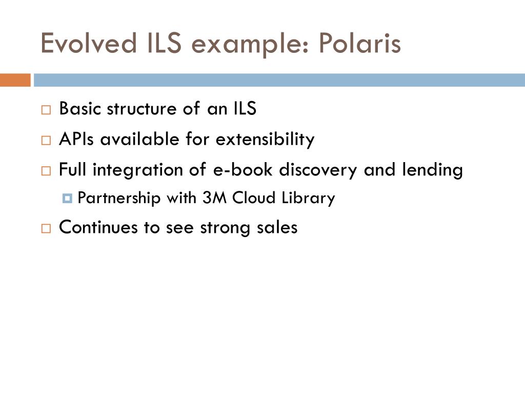 Basic structure of an ILS APIs available for extensibility Full integration of e-book discovery and lending Partnership with 3M Cloud Library Continues to see strong sales Evolved ILS example: Polaris