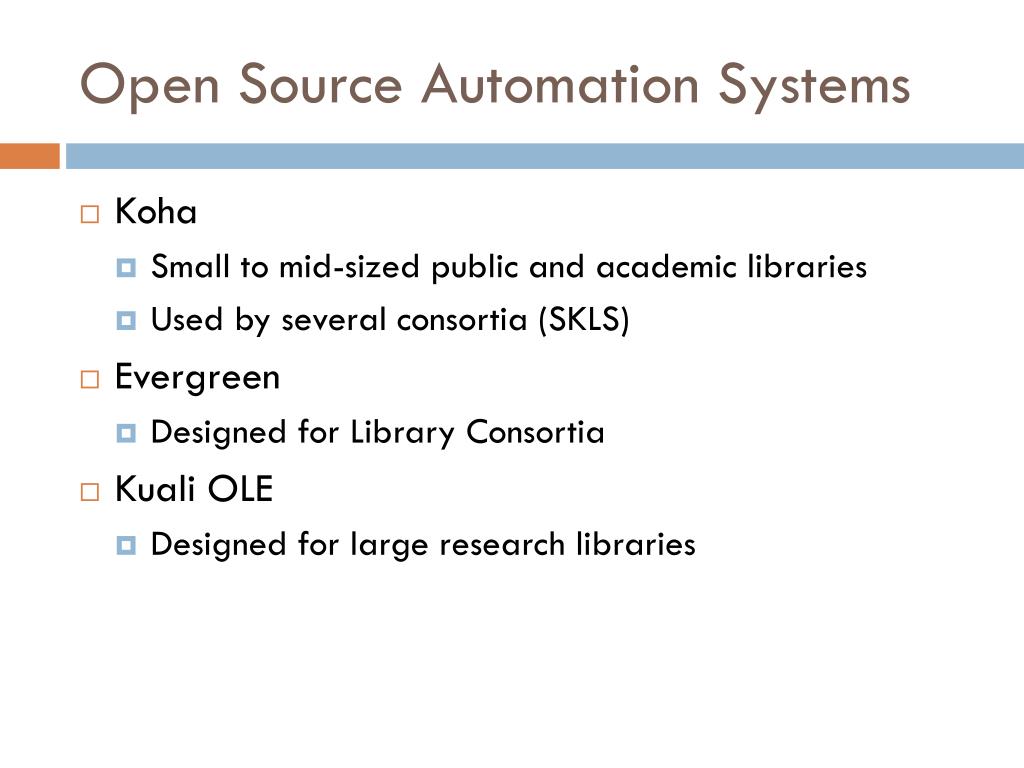 Open Source Automation Systems • Koha • Small to mid-sized public and academic libraries • Used by several consortia(SKLS) • Evergreen • Designed for Library Consortia • Kuali OLE • Designed for large research libraries